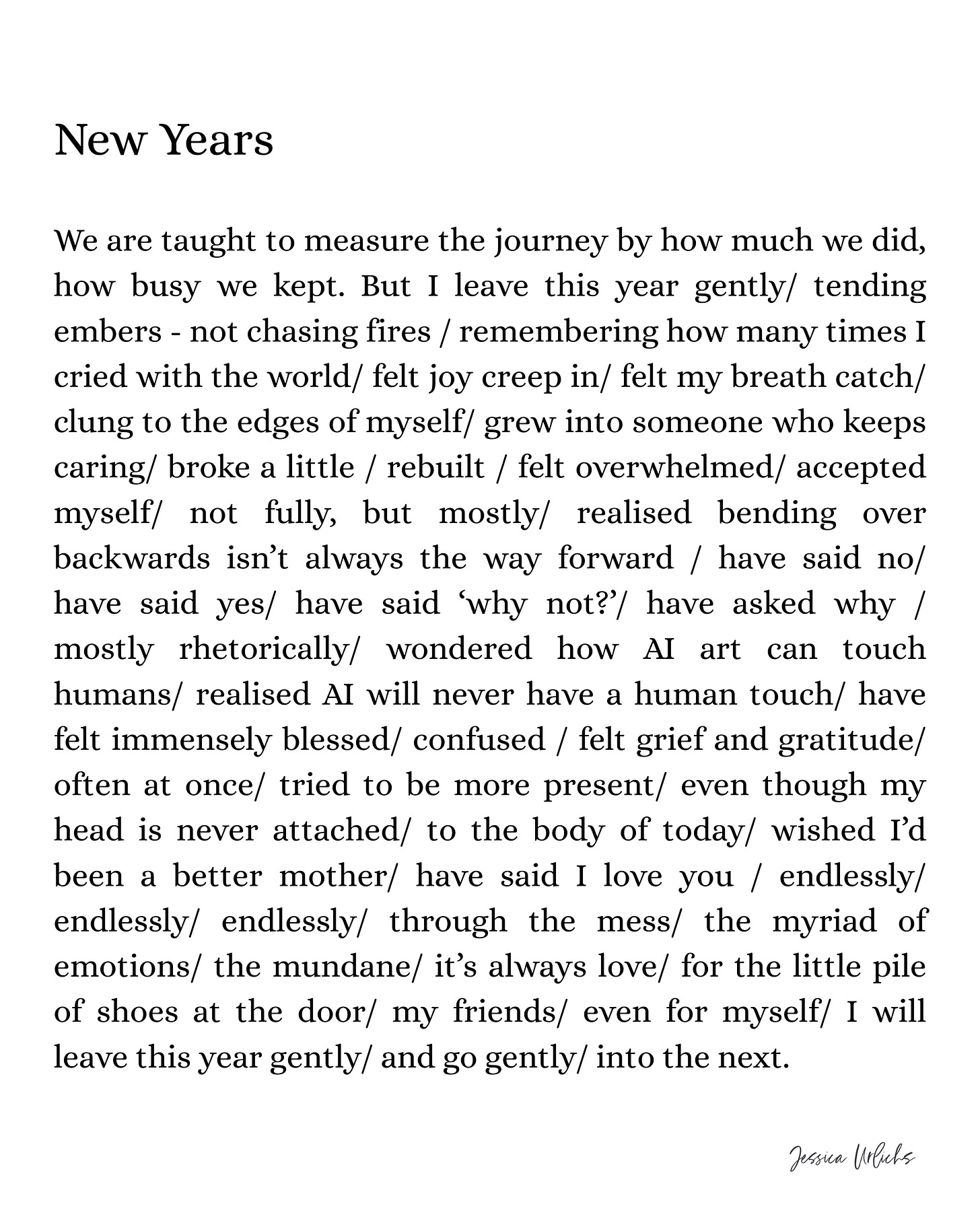 I wanted to leave this here because it’s not so much about New Years big energy from me, more so going gently (maybe I’m just getting older). But there is such an art in rest and reflection. It’s where the being takes over the doing. It’s something I will forever try to master but something I also know is worth the pursuit, rest is a requirement, not a reward. Each year feels busier, even though my eldest two are at school, I guess I always thought I would have more time but it doesn’t really end up that way? But I still watch them watching things, I still feel what they feel, that never leaves I don’t think… it just feels more rewarding to catch those moments because they’re harder to pin down.